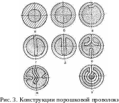 Из применяющихся конструкции порошковых проволок (рис. 3) наиболее распространены проволоки трубчатой конструкции (а, б, в ). Введение части оболочки внутрь сердечника (г, д, е, ж, з ) обеспечивает более равномерное плавление его и более эффективную защиту металла от воздуха.