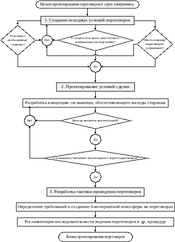 > правильно определить партнеров, их интересы, варианты отказа от сделки и благоприятное соотношение вариантов «сделка/отказ от сделки»; правильно выстроить последовательность действий и принять правильные решения по процедуре переговоров;