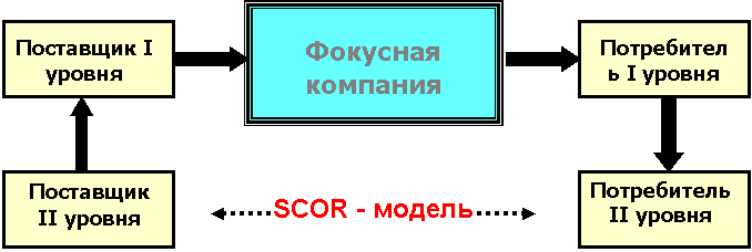 Расширенная цепь поставок является основой для построения референтной модели операций в цепях поставок - SCOR модели, так как подобная базовая структура цепи наиболее распространена в бизнесе.