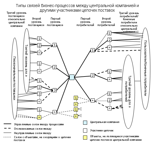 Связи с объектами, не входящими в цепочку поставок, связи этого рода не рассматриваются как связи структуры цепи поставок, но могут влиять на показатели ее деятельности.