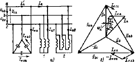 Векторная диаграмма цепи рис, 3.18, а приведена на рис. 3.18, б. На диаграмме показаны только те токи, которые определяют ток I'a (t. е. Ia и Iкa), а также токи, определяющие ток Iкa (т. е. Iкab и Iкca).