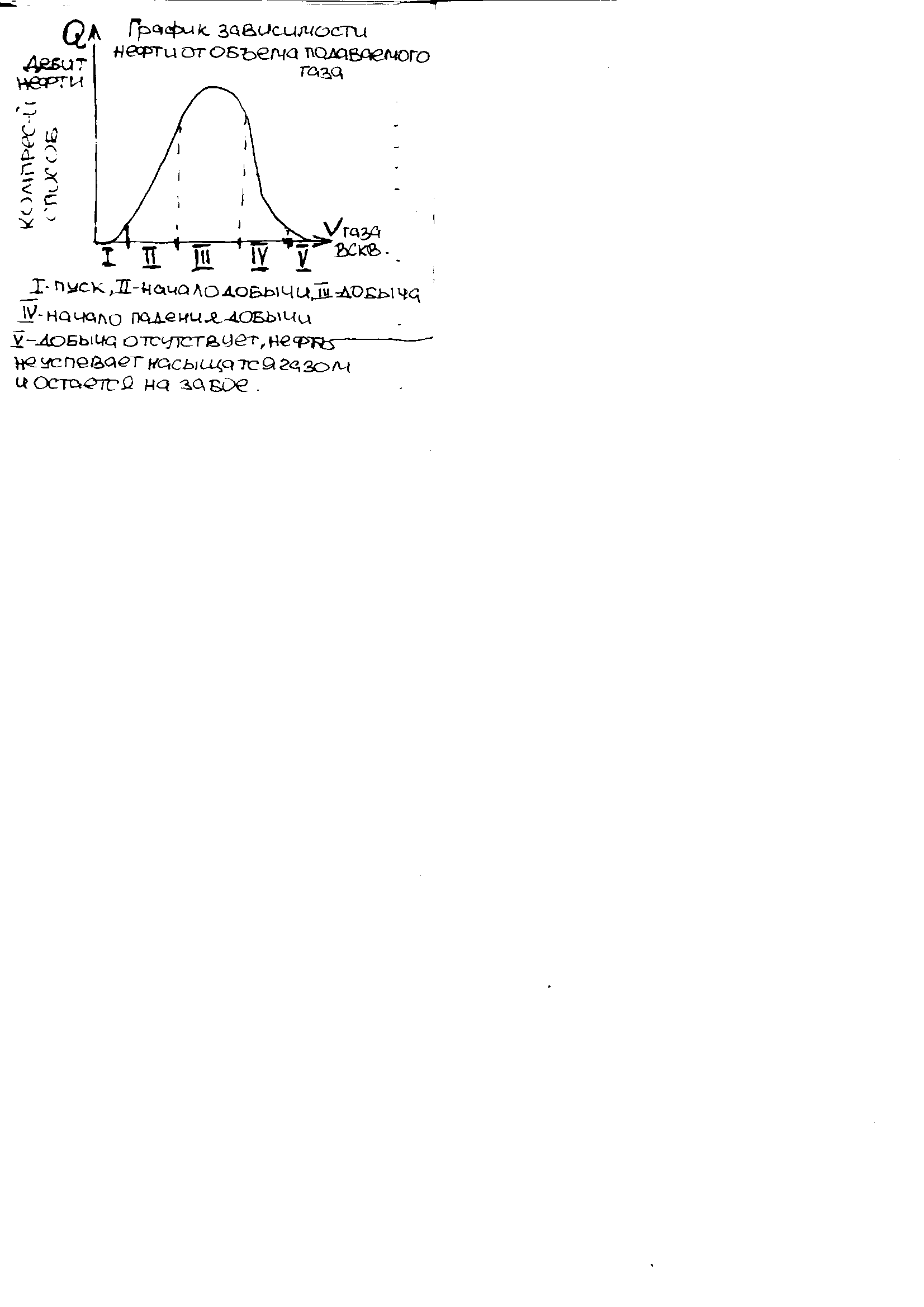 При компрессорном способе добычи определяют оптимальное кол-во газа для МАХ добычи нефти. На низ НКТ устанавливают клапана пусковые и рабочие. При подаче газа в затрубное пространство происходит его перемешивание с нефтью, тем самым уменьшается ее плотность. Далее насыщенная газом нефть, через клапана поднимается по НКТ, на поверхность. При падении уровня ниже пусковых клапанов, они закрываются, нефть уходит через рабочие клапаны, т.к. пусковое давление будет выше рабочего. Когда уровень падает ниже рабочих клапанов, подача газа прекращается и происходит процесс накопления нефти.