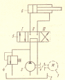 1-двигатель для привода насоса, 2-бак с рабочей жидкостью, 3-насос, 4-предохранительный клапан, 5-трехпозиционный распределитель, 6-гидроцилиндр.( рисунок 2,7)