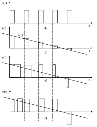 Рисунок 6.2 – Види модуляції: а) – сигнал, який генерується імпульсним елементом, б) – амплітудно-імпульсна модуляція, в) – широтно-імпульсна модуляція, г) – частотно-імпульсна модуляція