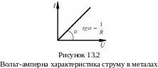 4. Вольт-амперна характеристика це графік залежності сили струму від напруги (рисунок 13.2). В металах струм лінійно залежить від напруги так, як зі збільшенням напруги більша кількість електронів проходить через переріз провідника, тобто зростає сила струму. Таку залежність сили струму від напруги описує закон Ома для ділянки кола.