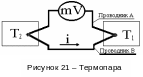 е) термоЭДС,, при соприкосновении двух различных металлов между ними возникает контактная разность потенциалов, обусловленная неодинаковой работой выхода электрона. Термоэлемент из двух различных проводников, образующих замкнутую цепь называют термопарой (рисунок 21).