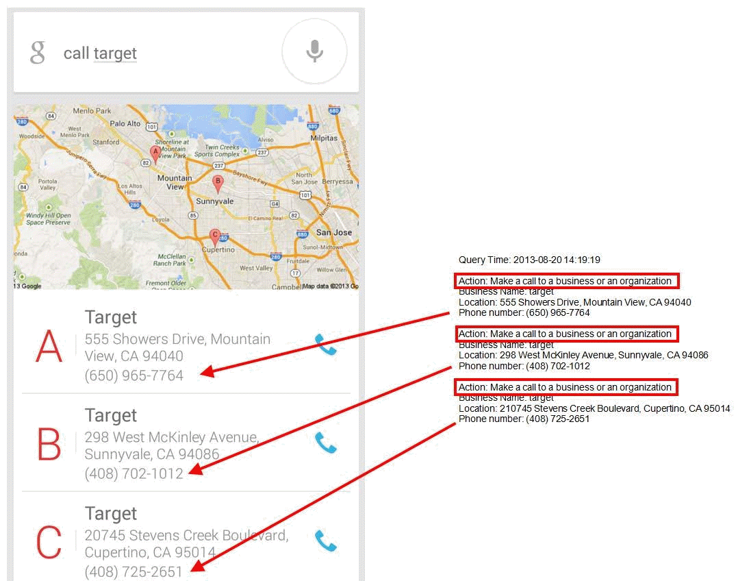 For some Device Action queries, the device displays a list of options to choose from before it can respond to the Device Action query. Here is an example for the query [call target]. The user is shown a list of Target stores in the area to choose from. This example shows that the Device Action result taken by the device will be to call the desired Target store after the user makes his/her selection.