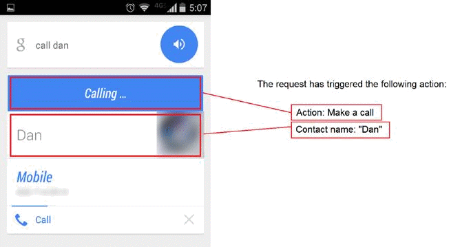 The left side shows what the user sees on the phone for the query [call dan], while the right side shows the “action text” that you (the rater) might see in the rating task. The user wants to dial the number stored for the contact “Dan” on the device. This text indicates that the device responded by displaying the contact’s phone number and dialing the number.