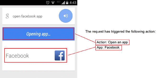 The left side shows what the user sees on the phone for the query [open facebook app]. In this case, the phone shows an “Opening app” message and then opens the app. The right side shows the “action text” that you (the rater) might see in the rating task. The text indicates that the device responded by opening the Facebook app on the user’s phone.