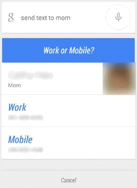 Result: In this Device Action Result Block, the query has initiated a text to the contact nicknamed “Mom,” with an option to text either the work or mobile number.