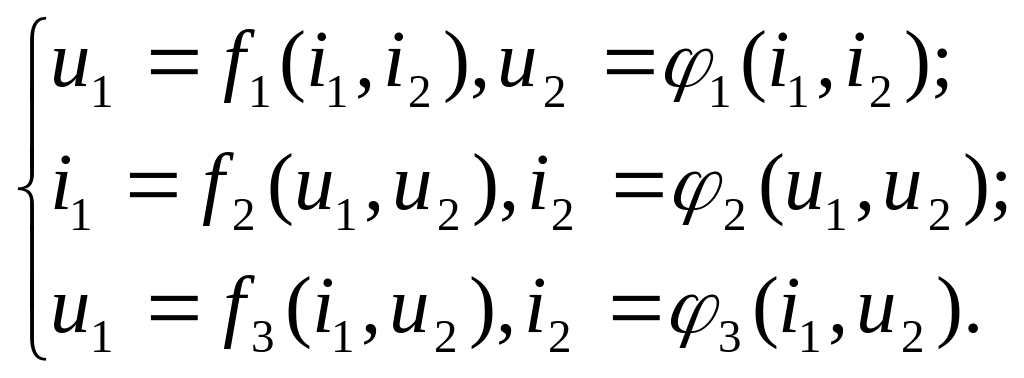 Характеристические параметры четырёхполюсника. Величины i1, u1 ,i2, u2, характеризующие электрические свойства транзистора, взаимно связаны. Если любые две из этих величин заданы, то оставшиеся определяются однозначно по статическим характеристикам или параметрам транзистора. Коэффициенты в уравнениях четырёхполюсника, связывающие внешние токи и напряжения, называются характеристическими параметрами транзистора как четырёхполюсника (транзистора как элемента схемы).