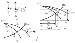 Рис. 3.14. Построение гидравлической характеристики системы с насосными установками, включенными в разных узлах: а- принципиальная схема; б- приведение характеристики насоса А к узлу 2-2; в- определение расходов воды и напоров при параллельной работе