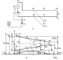 На рис. 3.16,б показаны следующие пьезометрические графики: AKLD - тепловой сети без включения перемычки; ABCD - то же после включения перемычки; AOD - перемычки.