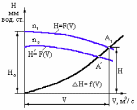 DDH = f(V) - характеристика тепловой сети; точка А - пересечение этих характеристик, определяет гидравлический режим системы; Н - напор, развиваемый насосом, равный потере напора в замкнутой системе, м; V - объемная подача насоса, равная расходу воды в системе.
