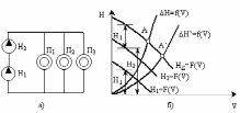 Рис.3.13. Схема (а) и построение (б) суммарной характеристики при последовательном включении насосов