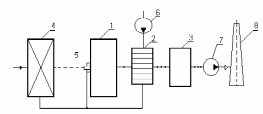 Рис. 8.1. Схема газовоздушного тракта для каменного угля: 1 – паровой котел; 2 – воздухоподогреватель; 3 – золоуловитель; 4 – пылеприготовительная установка; 5 – горелка; 6 – дутьевой вентилятор; 7 – дымосос; 8 – дымовая труба