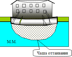 2) Вечномёрзлый грунт, как основание. Подходит для необогреваемых и отапливаемых сооружений на суглинках и насыщенных льдом грунтах. Все части одной постройки должны располагаться на одном основании, иначе при нарушении температурного поля постройки в результате теплового влияния здания появится чаша оттаивания.
