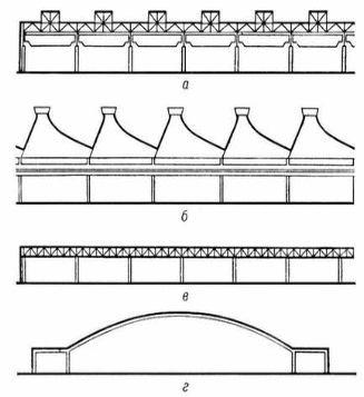 б — многопролетное здание с аэрационными вытяжными шахтами ;