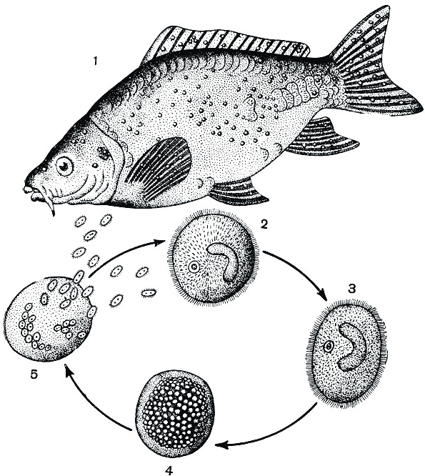 Цикл развития возбудителя ихтиофтириоза - Ichtyophthirius multifiliis: 1 – рыба, больная ихтиофтириозом; 2 — трофонт на теле рыбы; 3 — зрелый трофонт, покинувший рыбу; 4 - деление паразита в цисте размножения; 5 — выход бродяжек