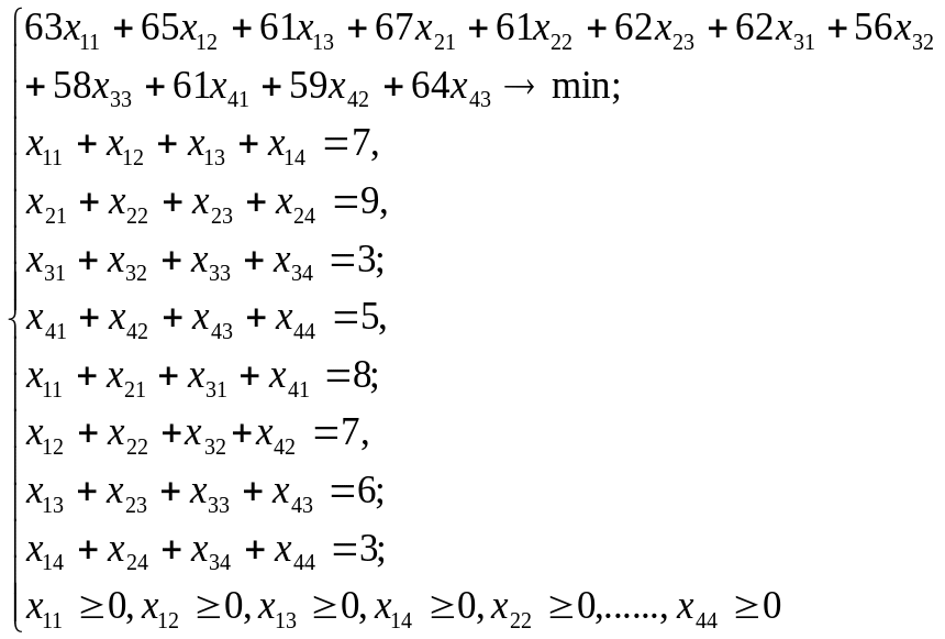В этой задаче целевая функция показывает, сколько тысяч тонно-километров уходит на перевозку сырья. Левые части первых четырех ограничений выражают количества вывозимого сырья из соответствующих пунктов хранения, левые части следующих трех ограничений-количества ввозимого сырья на соответствующие предприятия. Последние двенадцать ограничений означают, что массы перевозимого сырья не могут принимать отрицательные значения.