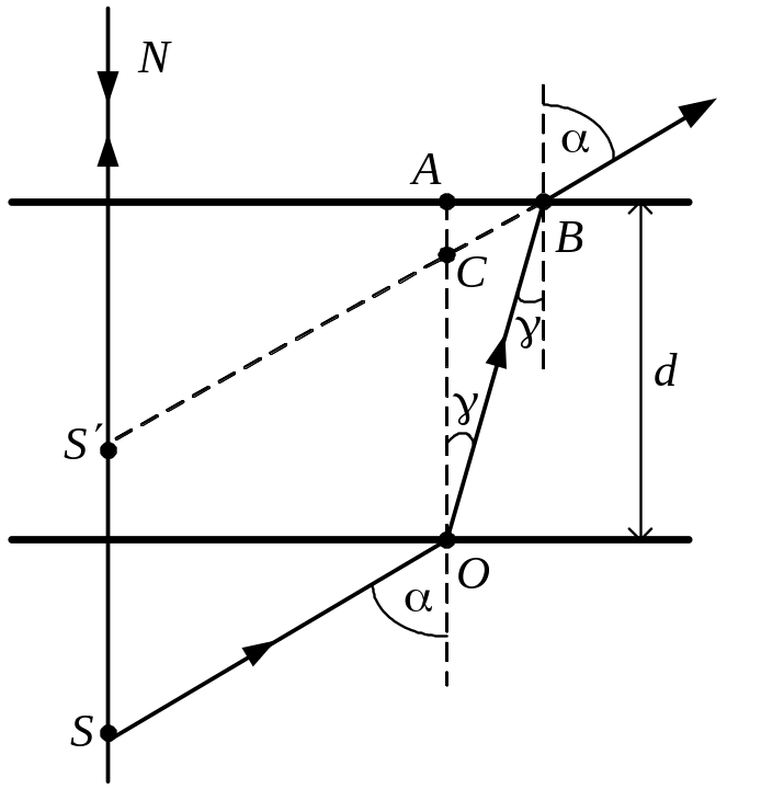 Наблюдатель рассматривает светящуюся точку через плоскопараллельную стеклянную пластину с показателем преломления 1,5 толщиной 3 см так, что луч зрения нормален к пластине. Определить расстояние между светящейся точкой и ее изображением (см. рис.).
