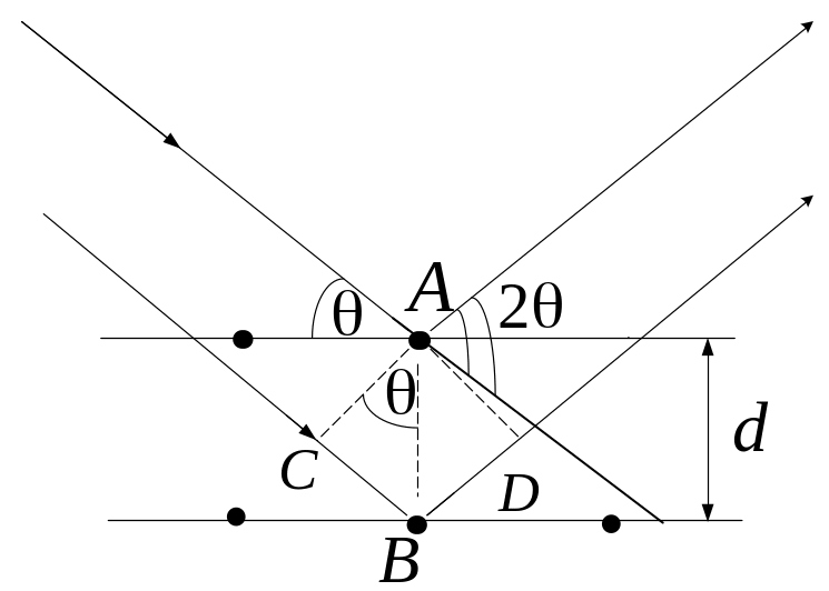узлы – атомы (например, А, см. рис.) кристаллической решетки. Эти плоскости называют атомными. Отражение наблюдается лишь в направлениях, соответствующих дифракционным максимумам, которым удовлетворяют выражения
