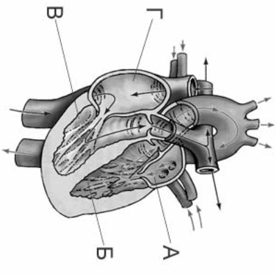 А92.На рисунке изображена схема строения сердца человека. Какой буквой на ней обозначено правое предсердие?