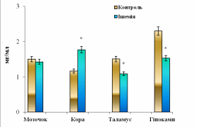 Дані для таламусу представлені на рис. 3. 6. Як згадувалося раніше, у цьому відділі мозку проявляється тенденція до зменшення рівня загального протеїну (ЗП) у цитозольних фракціях на 27,8% при порівнянні з нормою.