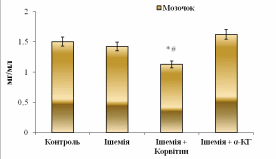 При 5-денному введенні Корвітину та 6-денному введенні альфа-кетоглутарату показники ЗП складають відповідно 1,13±0,19 мг/мл та 1,62±0,10 мг/мл відповідно. При порівнянні з ішемічною групою тварин з рис. 3. 4 видно, що Корвітин знижує вміст ЗП в 1,3 рази (на 20,9 %). При порівнянні з контролем цей показник є нижчим на 24,9%. Такі співвідношення свідчать про те, що препарат здійснює відчутний вплив на клітини мозочка, оскільки знижує вміст продуктів катаболізму білків, знижує стійкість клітин до низьких концентрацій кисню і, в наших дослідженнях, не сприяє проявляє регенеративної дії на нервову тканину мозочка після генералізованої ішемії.