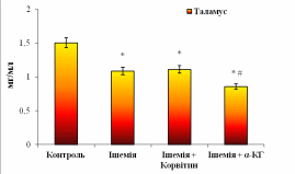 Якщо ж співставити показники білка для Корвітину та α-КГ, бачимо, що в другому випадку вміст ЗП знижений на 22,8% відносно корвітинової групи, тобто α-КГ чинить сильніший вплив на уражені клітини таламусу на відміну від Корвітину. Однак не можна не враховувати той факт, що зниження білка може відбуватися і в нормальних клітинах, розташованих поблизу від вогнищ ішемії.