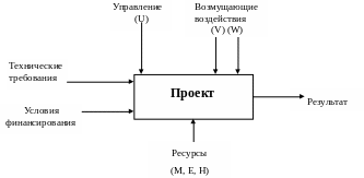 Выполнение работ обеспечивается наличием необходимых ресурсов: материалов и финансов (М), оборудования (Е), человеческих ресурсов (Н). Эффективность работ достигается за счет управления (U) процессом реализации проекта, которое обеспечивает распределение ресурсов М, Е, Н, координацию выполняемой последовательности работ и компенсацию возмущающих внутренних (V) и внешних (W) воздействий.