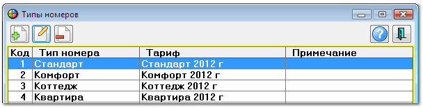 У Довіднику типів номерів знаходиться інформація про всіх можливих типах Номерів готелю. Вікно "Типи номерів" відкривається через пункти головного меню програми "Довідники" - "Типи номерів".