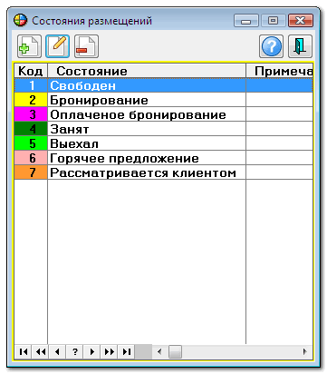 У Довіднику станів розміщень знаходиться інформація про можливі станах Розміщень та їх колірних позначеннях. Вікно "Стану розміщень" відкривається через пункти головного меню програми "Довідники" - "Стани".