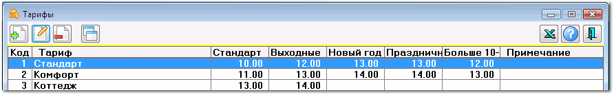 Довідник тарифів викликається через пункти головного меню програми: "Довідники" - "Тарифи", або однойменною кнопкою на панелі інструментів програми. Цей довідник містить інформацію про тарифи для всіх типів номерів. Ці дані використовуються для автоматичного вибору тарифу в Розміщенні.