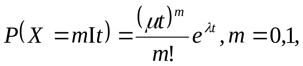 В этом случае число событий X, прибывающих автомобилей-такси за время t, распределяется по закону Пуассона. Так как μ = 1/t — среднее число поступающих автомобилей-такси в единицу времени, то вероятность поступления X = т автомобилей-такси за время t