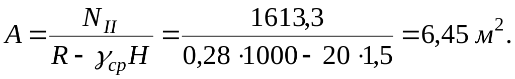 Необходимая площадь подошвы фундамента под колонну при расчетном сопротивлении грунта в основании R = 0,28 Мпа = 280 кН/м2, отметке подошвы (заложении) фундамента H = 1,5 м и усредненного объемного веса фундамента и грунта на его уступах m = 20 103 кН/м 3.