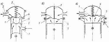 В прямоточных компрессорах (рис. 10,1а) всасывающие клапаны 5 расположены в днище поршня 6,а нагнетательные клапаны 1, в верхней внутренней крышке безопасности 4. Всасывающий патрубок 7 компрессора сообщается с полостью поршня, нагнетательный патрубок 2 расположен в верхней части цилиндра.