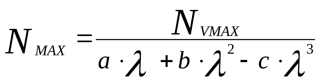 Если известны максимальная мощность ДВС, угловая скорость вращения КВ при максимальной мощности, то скоростная характеристика ДВС при полной подаче топлива может быть построена по формуле: