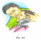 3. Прием: палец позади зубов (Сафар). При значительном сокращении (напряжении) жевательных мышц. Указательный палец левой руки вводят позади моляров и открывают рот, упершись на лоб правой рукой (рис. 3) После открытия рта, в котором есть инородные тела, их удаляют.