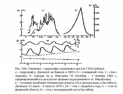 Сдвиг между внутрисуточными экстремумами температуры воздуха и расходом талых вод в истоках ледниковых рек увеличивается с увеличением размера ледника и его высоты от 1-2 до 6-9 часов (рис. 3.66, а,в). Так, с ледника Федченко максимальный сток отмечается в 20 - 24 ч, минимальный – в 9 - 12 ч [19]. Регулирование стока ледником связано с наличием в его теле заполненных водой полостей, а также с накоплением воды в пористой снежно-фирновой толще, коэффициенты фильтрации которой невелики (5 – 6 м/сут). По этим причинам на ледниковых реках максимум стока обычно смещается на вторую половину лета (рис. 3.66, а).Ледники могут вызывать катастрофические паводки и сели. Эти опасные явления возникают по следующим причинам: прорыв приледниковых или надледниковых озер; прорыв внутриледниковых полостей; катастрофическое таяние, вызванное изверженияеми вулканов.