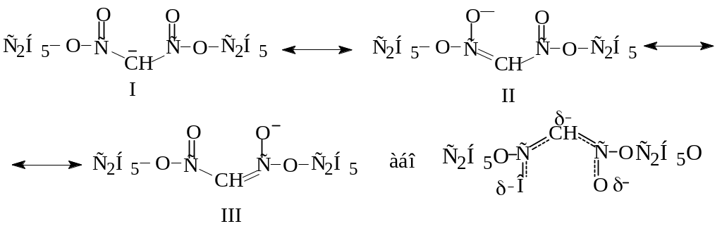 Можливість утворення натріймалонового естеру пояснюється високою стабільністю його карбаніону, негативний заряд якого за рахунок спряження делокалізується між центральним атомом вуглецю (І) та двома карбонільними киснями (ІІ і ІІІ):