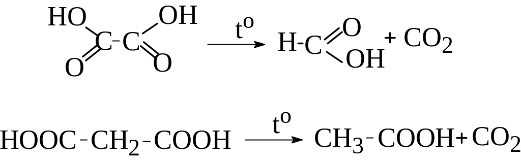 При нагріванні вказаних кислот вище температури топлення відбувається декарбоксилювання (відщеплення СО2) однієї карбоксильної групи.