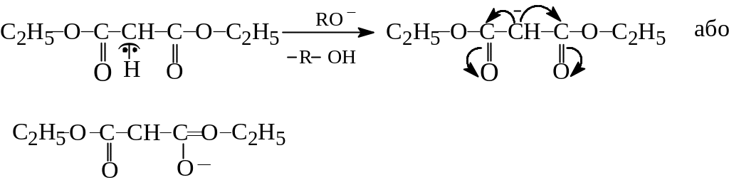 У присутності алкоголятів лужних металів малоновий естер обмінює один з протонізованих воднів метиленової групи на йон натрію з утворенням натріймалонового етеру або діетилмалонату натрію.