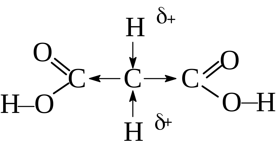 Атоми водню метиленової групи малонової кислоти характеризуються високою кислотністю, завдяки значній поляризації зв'язків С-Н, внаслідок прояву -І-ефекту двох карбоксильних груп.