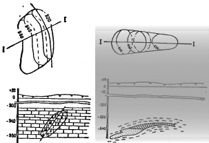 тел. Благодаря непрерывной поверхности (кровля-подошва), ограничивающей линзовидное тело, структурная схема этой поверхности изображается системой замкнутых и частично совмещенных изолиний