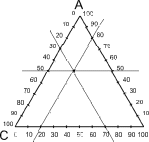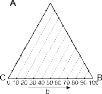 Кратко принципы построения тригонограмм заключаются в следующем. График имеет форму равностороннего треугольника. Каждая его сторона представляет собой шкалу концентраций одного компонента от 0 до 100%. Положение любой точки на графике задано тремя координатами, сумма которых постоянна и равна 100%. A, B, C – это условные наименования компонентов, фракций, элементов или чего-то другого в составе анализируемых объектов