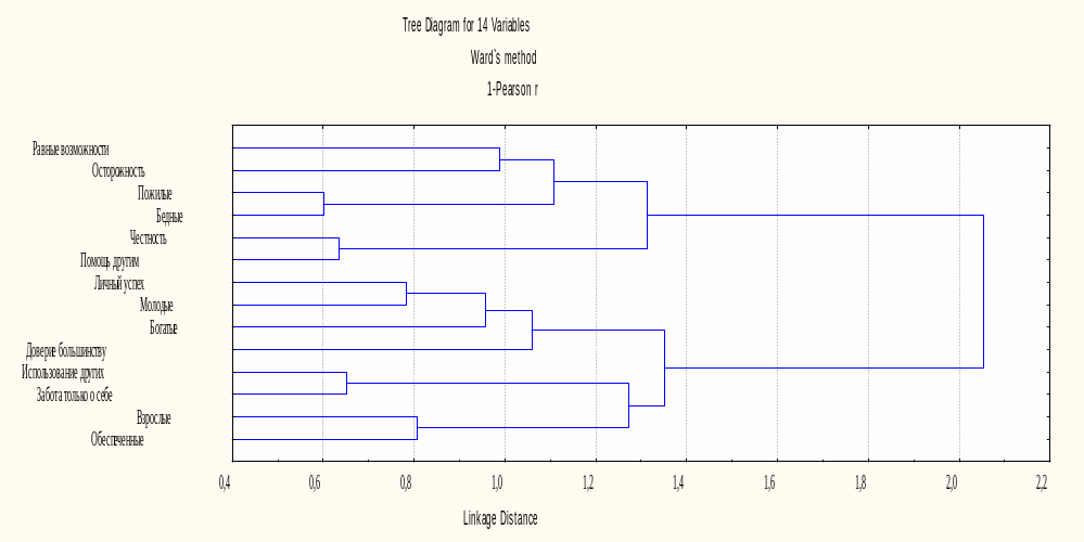 * На рис.4.1 приводятся сокращенные названия переменных, обозначающих позитивные и негативные моральные установки. Это обусловлено ограничением количества знаков, существующим в пакете Statistica. Анализ выполнен с помощью пакета Statistica. Версия 6.0. «Обрезка» дендрограммы рекомендуется на уровне 1,35. Источник: Европейское социальное исследование. 4-я волна. 2008 г. Российская часть базы ESS4e02. URL: http://ess.nsd.uib.no/ess/ Объяснение данных см.: Артёмов Г.П. Социология морали. СПб., 2011. С. 76-78.