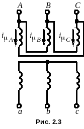 Пусть на холостом ходу к сети с синусоидальным напряжением подключена первичная обмотка, соединенная треугольником, а вторичная обмотка, соединенная в звезду, разомкнута (рис. 2.3). Фазные напряжения первичной обмотки синусоидальны. Поэтому потоки каждой фазы также будут синусоидальными, а реактивные составляющие тока намагничивания будут содержать высшие нечетные гармоники.