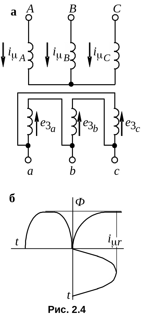 При отсутствии наиболее значимых третьих гармоник реактивные составляющие тока намагничивания можно полагать синусоидальными. Тогда, согласно рис. 2.4, б, высшие гармоники появятся в фазных потоках: