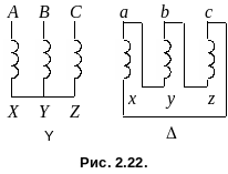 В большинстве случаев обмотки трехфазных трансформаторов соединяют либо в звезду -Y, либо в треугольник - (рис. 2.22).